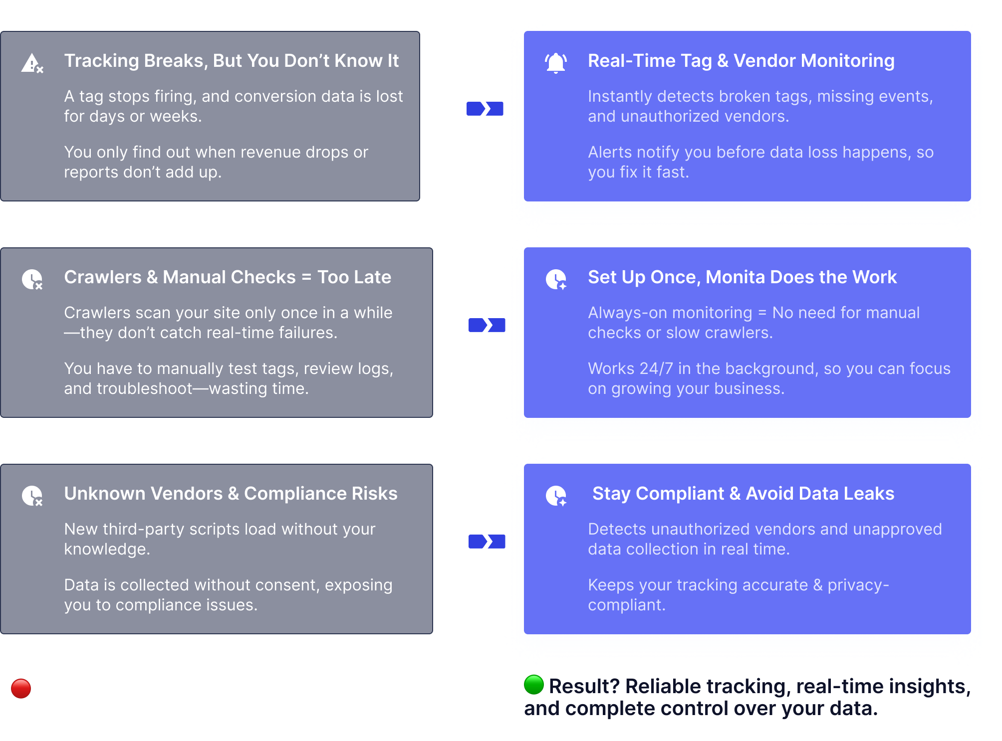Monita continuously audits your third-party vendors, ensuring they send the right data—at the right time.